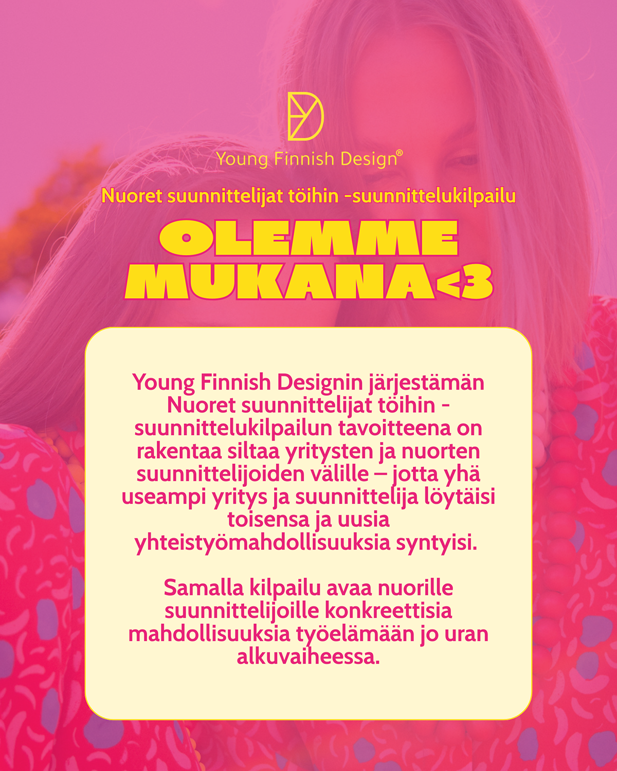 Kilpailu käynnistyy torstaina 16.4. Helsingissä lanseeraustilaisuudessa taidehotelli AX:ssä yhdessä osallistuvien yritysten kanssa – ja mukana on jo suunnittelijoitakin tutustumassa kilpailuun ja brändeihin paikan päällä. Luvassa on jännitystä ja inspiroivaa uutta luovaa näkemystä! Kilpailun avulla yritykset saavat tuoreita ulkopuolisten näkemyksiä luovia tarpeitaan varten, myös markkinointinäkyvyyttä ja suoran kontaktin tulevaisuuden suunnittelijoihin.