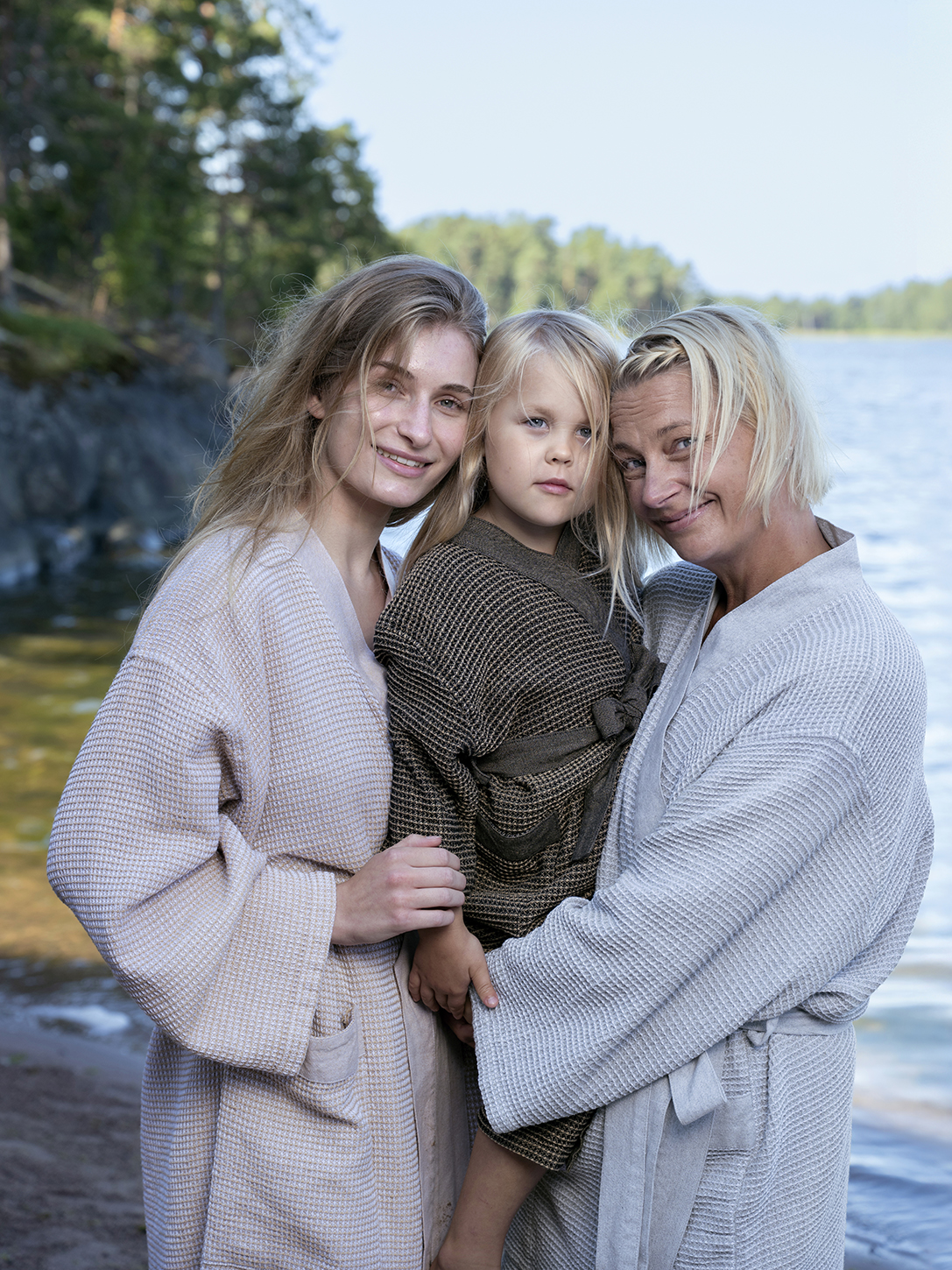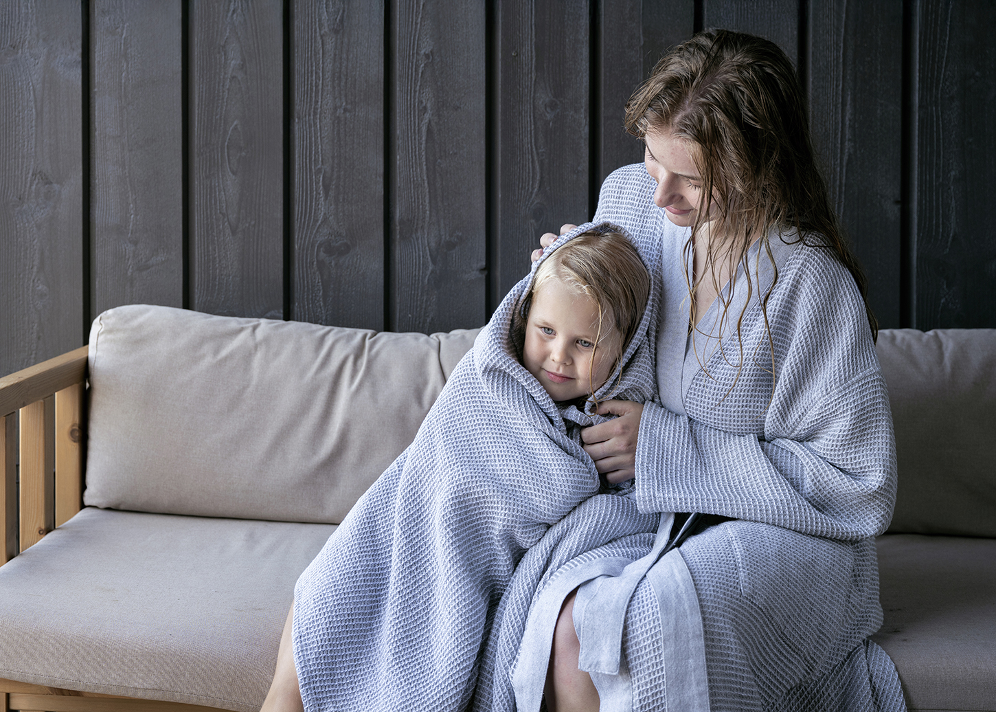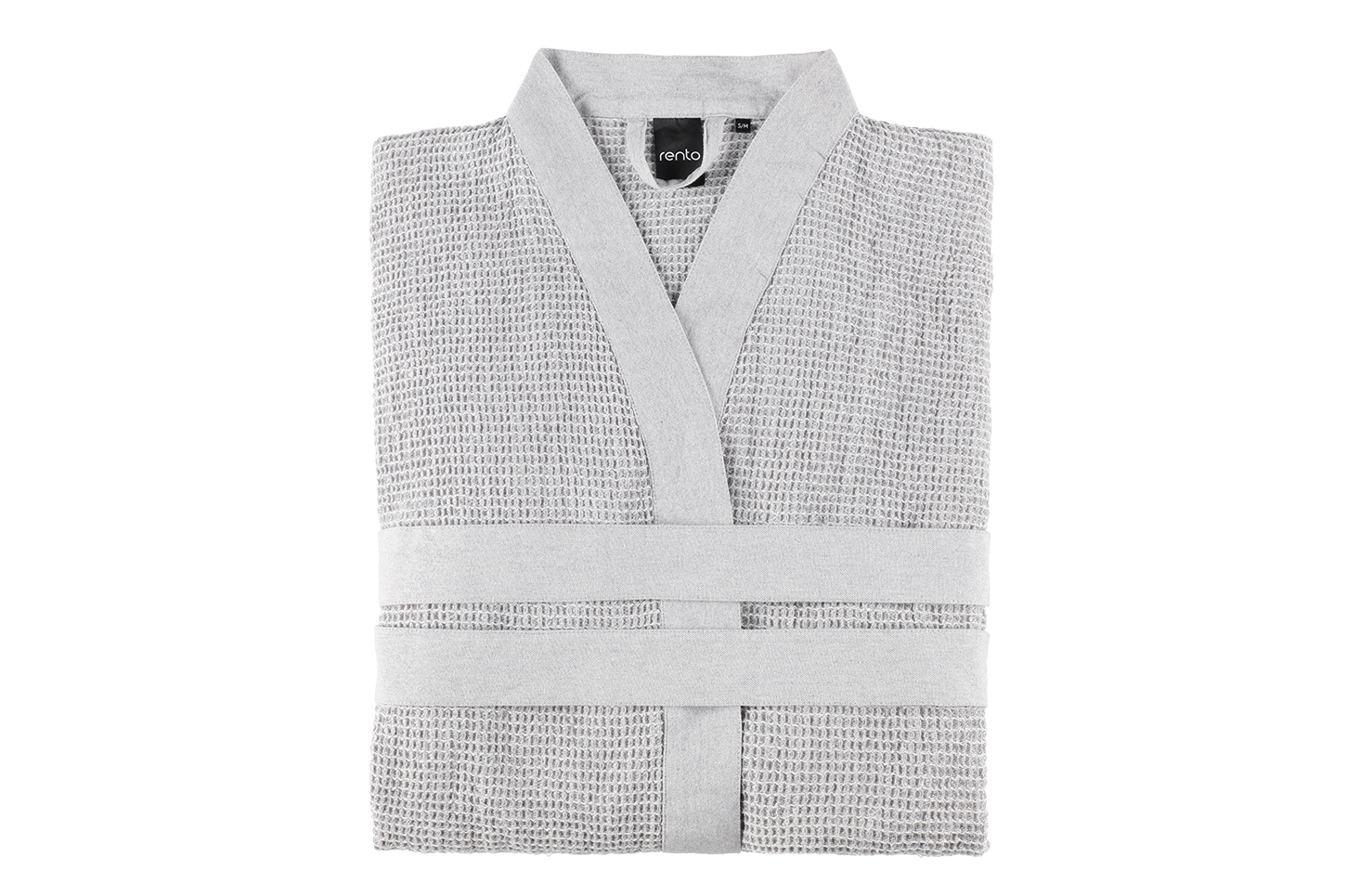 Comfy bath robe with chambray borders and belt. Kenno sauna textiles are made of recycled cotton, giving the fabric a natural softness and vibrant texture.