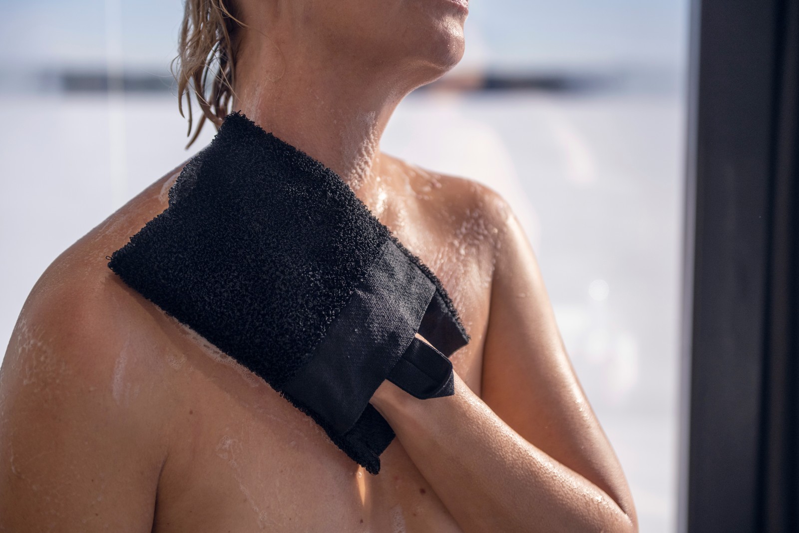 Gently clean sauna-softened skin with a linen terry cloth washcloth. The palm side of the wash mitt is double-lined.