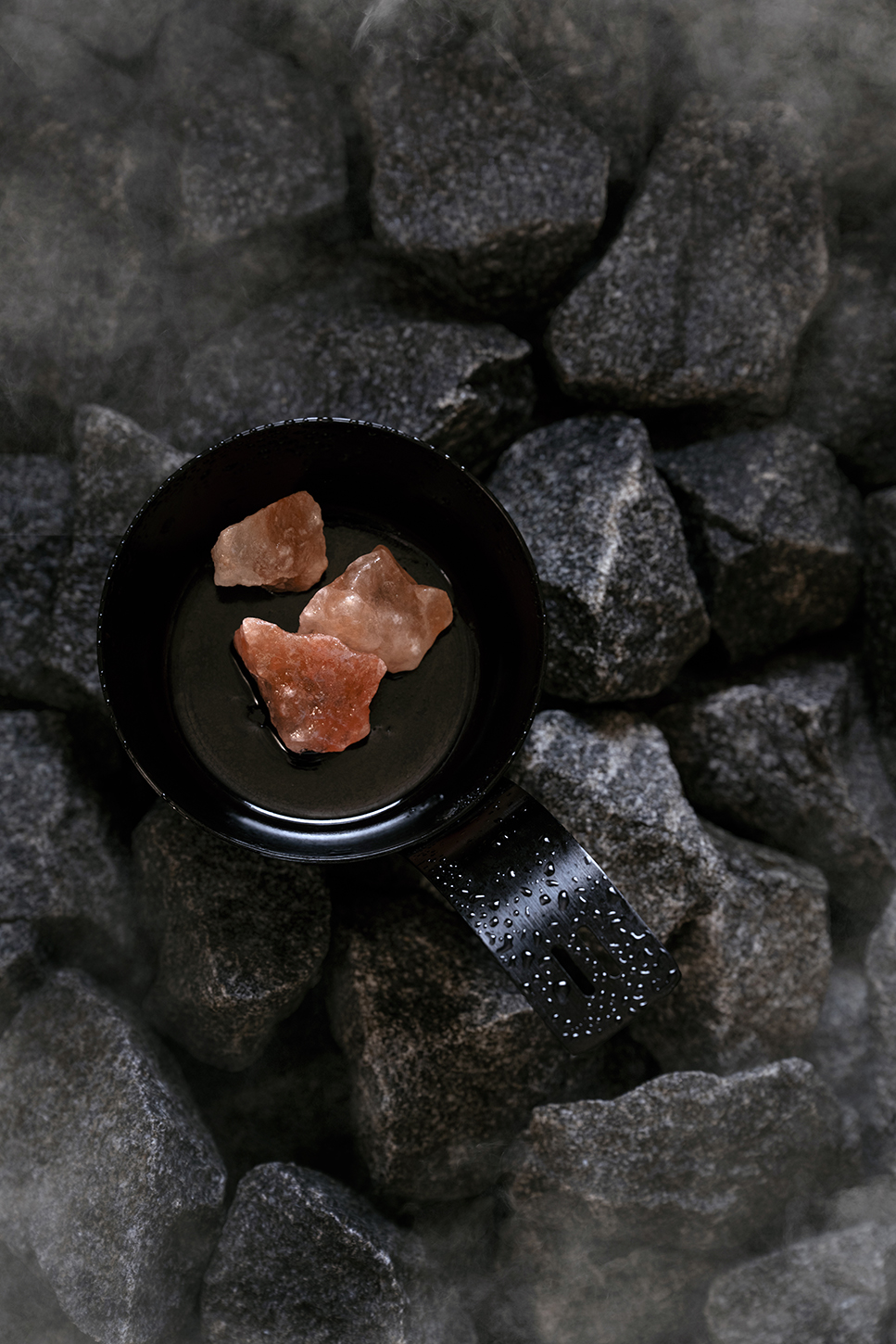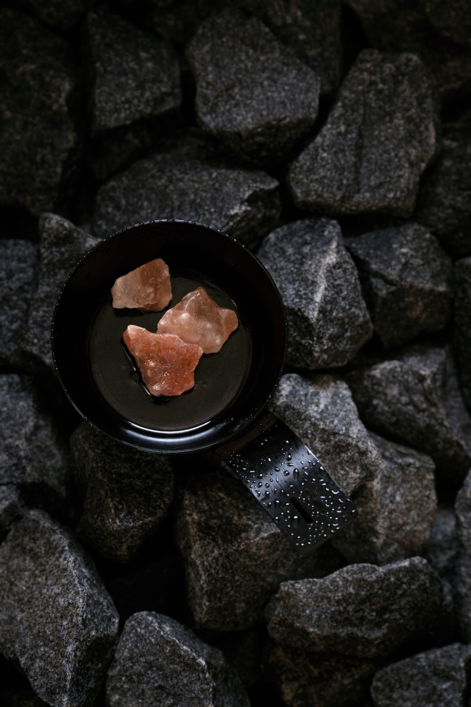 Lahjapakkaus rentouttavan saunomisen ystävälle. Pakkaus sisältää vaaleanpunaisen ruususuolakiven (Himalajan suola) ja metallisen kipon, johon suolakiven voi asettaa höyrystymään saunomisen ajaksi.